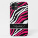 Stylish custom iPhone 5 case personalised with your name, and designed with a zebra print pattern with black, white, and hot fuchsia pink zebra stripes.