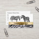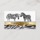 Zebra stripes wildlife business cards with two zebras and zebra stripes pattern along with a gold metallic like accent element and modern two side design. Great text layout you can customise online in this distinctive look makes a classy business card template designed for an animal theme, nature or wildlife theme.