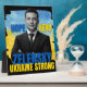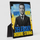 Honouring the fearless and charismatic President of Ukraine, Volodymyr Zelenskyy - this tabletop plaque features black and white photo cutout of the country's leader with blue and yellow "hope" "Hero" "Ukraine Strong" words on watercolor blue and yellow brushstroke background