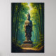 This artwork captures a profound harmony between the human-made and the natural. Amid the tranquil chaos of a Japanese bamboo forest, a beautifully carved Buddha statue stands as a testament to enduring faith. Each slender stalk of bamboo reaches skyward, a living frame for the statue's calm presence. The rich greens and cool greys of the scene are a visual haiku—a perfect, simple moment of balance where the fleeting beauty of nature and the lasting power of spirit become one.