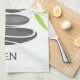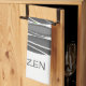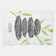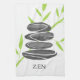 Zen kitchen towel with pebble stones stacking art. Graphic design with green bamboo leaves.