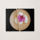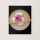 Zen style arrangement of orchid flower, pebble and bamboo bowl on black background