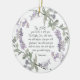 Inspirational scripture personalized Christmas ornament depicts floral watercolor wildflowers in soft colors of dusty purple, pink, and soft green shades. It features Bible Verse Zephaniah 3:17, "The LORD your GOD in your midst, The Mighty One, will save; He will take great delight in you, He will quiet you with His love, He will rejoice over you with singing." Customize the back with a name and date or the details of your choice.~