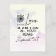 Postcard with inspirational quote scripture depicts a modern abstract design with lavender and pink brush strokes and splashes. It features a portion of an encouraging Bible Verse Zephaniah 3:17, "With His love he will calm all your fears." The greeting, prayer can be personalised or deleted for a hand written message.