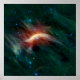 Zeta Ophiuchi The blue star near the center of this image is Zeta Ophiuchi. Zeta Ophiuchi is actually a very massive, hot, bright blue star plowing its way through a large cloud of interstellar dust and gas. Astronomers theorize that this stellar juggernaut was likely once part of a binary star system with an even more massive partner. It's believed that when the partner exploded as a supernova, blasting away most of its mass, Zeta Ophiuchi was suddenly freed from its partner's pull and shot away like a bullet moving 24 kilometers per second (54,000 miles per hour). Zeta Ophiuchi is about 20 times more massive and 65,000 times more luminous than the sun. If it weren't surrounded by so much dust, it would be one of the brightest stars in the sky and appear blue to the eye. Like all stars with this kind of extreme mass and power, it subscribes to the 'live fast, die young' motto. It's already about halfway through its very short 8-million-year lifespan. In comparison, the sun is roughly halfway through its 10-billion-year lifespan. While the sun will eventually become a quiet white dwarf, Zeta Ophiuchi, like its ex-partner, will ultimately die in a massive explosion called a supernova. Perhaps the most interesting features in this image are related to the interstellar gas and dust that surrounds Zeta Ophiuchi. Off to the sides of the image and in the background are relatively calm clouds of dust, appearing green and wispy, slightly reminiscent of the northern lights. Near Zeta Ophiuchi, these clouds look quite different. The cloud in all directions around the star is brighter and redder, because the extreme amounts of ultraviolet radiation emitted by the star are heating the cloud, causing it to glow more brightly in the infrared than usual. Even more striking, however, is the bright yellow curved feature directly above Zeta Ophiuchi. This is a magnificent example of a bow shock. In this image, the runaway star is flying from the lower right towards the upper left. As it does so, its very powerful stellar wind is pushing the gas and dust out of its way (the stellar wind extends far beyond the visible portion of the star, creating an invisible 'bubble' all around it). And directly in front of the star's path the wind is compressing the gas together so much that it is glowing extremely brightly (in the infrared), creating a bow shock. It is akin to the effect you might see when a boat pushes a wave in front it as it moves through the water. This feature is completely hidden in visible light. Infrared images like this one from WISE shed an entirely new light on the region. The colors used in this image represent specific wavelengths of infrared light. Blue and cyan (blue-green) represent light emitted at wavelengths of 3.4 and 4.6 microns, which is predominantly from stars. Green and red represent light from 12 and 22 microns, respectively, which is mostly emitted by dust. Edited text from NASA.