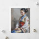 A woman dressed in traditional East Asian attire sits gracefully while looking downwards. The detailed floral patterns and vibrant colours of her dress contrast with the soft, muted background.