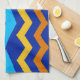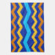 Cotton kitchen towel in a colourful blue, orange and gold zigzag design.