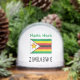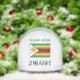 Personalised snow globe features the Zimbabwean Flag and the word ZIMBABWE below. Above, add a name in green letters. Cool holiday gift or stocking stuffer.