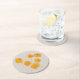 This paper coaster features a floral illustration consisting of a bouquet of orange zinnias in the centre, on a light grey background.