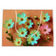 This vibrant botanical study celebrates the Zinnia elegans , rendered in a loose, expressive style that captures both natural beauty and artistic interpretation. Turquoise, buttercup yellow, and soft pink petals radiate from rich brown centres, contrasting boldly against a warm, earthy backdrop of terracotta and burnt sienna. The textured brushstrokes evoke a sense of movement, as if the flowers sway gently in a sunlit garden.