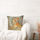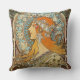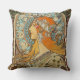 A throw pillow with the lithograph, Zodiac (1896) by Alphonse Mucha, a Czech born illustrator and painter. A portrait of a woman with jewels in her hair sitting in front of a zodiac chart.