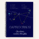 Zodiac Constellation Capricornus or goat with a horn. The colour of the stars is roughly real. Star and space objects' names. According to one of the myths, Capricornus is a creature that is a blend of a fish and a goat; the name means "goat horn"in Latin. The story develops as follows. Bacchus - the god of wine was feasting on the banks of the River Nile, and jumped into the river. The underwater part of him was transformed into a fish, while his upper body became that of a goat. The silver lining is that from his position Bacchus saw the giant Typhoeus coming to kill Jupiter. So Capricornus blew his pipes and Typhoeus fled. Jupiter, also known as Zeus, placed the new shape of Bacchus in the sky by way of thank you. Capricornus is the Zodiac constellation. The Sun transits the area along the Ecliptic line between December 22 - January 19. Unique, one-of-a-kind, beautiful, and funny spiral notebook for anyone to write down valuable insights. Customisable. You can change images, and you can change or delete template texts on the front and on the back. Do not forget to use the "Personalise", or "Edit Design" (as the case may be) button. It will transfer you to the "Designer Tool" area where you can use the "FILL/FIT" option to ADJUST THE DESIGN TO THE SIZE AND SHAPE of the product, to rotate it, to change the position, and colour of the background, etc. Just be creative, enjoy, and be happy.
