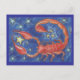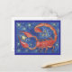 Scorpio, the scorpion, is surrounded by shining stars. Water sign, October 24 - November 22 (there may be a variation in the dates). Postcard with an orange, red, blue and yellow customisable design for you to personalise with your own text, images and ideas. An original coloured pencil and metallic ink drawing by Jess Perry.