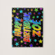 This vibrant, lively, birthday-themed jigsaw puzzle design has the message "HAPPY BIRTHDAY, ZOE" with the characters having a colorful rainbow spectrum inspired gradient pattern, in addition to a fun field of stars background pattern. An exciting puzzle like this might be a fun way to send birthday wishes to somebody named Zoe. [~Z0000468]