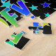 This fun, exciting, birthday-themed jigsaw puzzle design has the message "HAPPY BIRTHDAY, ZOEY" with the characters having a colourful rainbow spectrum inspired gradient pattern, along with a lively field of stars background pattern. An exciting puzzle like this might be used to send birthday greetings to somebody named Zoey. [~Z0000468]