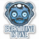 Vector cartoon illustration of a zombie astronaut with big eyes wearing a space helmet with a cracked glass shield in shades of blue with Everything Is Fine text. Tags: astronaut, cosmonaut, helmet, zombie, space, spaceman, monster, cadet, corpse, dead