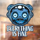 Vector cartoon illustration of a zombie astronaut with big eyes wearing a space helmet with a cracked glass shield in shades of blue with Everything Is Fine text. Tags: astronaut, cosmonaut, helmet, zombie, space, spaceman, monster, cadet, corpse, dead
