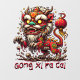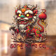 Chinese New Year Lion stepping on bones with a red lantern hanging from its tail.