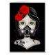 This unique design features a sad looking girl wearing a gas mask. Two red roses appear in the girl's hair that are echoed in a tattoo on her shoulder. A bio hazard symbol sits in the middle of the gas mask which represents the zombie apocalypse.