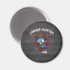 A macabre magnet with a cool looking zombie, wearing ripped and tattered clothing with arms outstretched looking for brrraaaaiiins. Big vacant eyes with a sickly green rotting skin. Blood splatters behind his head. Text says zombie hunter, in curved lettering and is also customisable if you want to change what it says.
