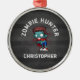 A macabre ornament with a cool looking zombie, wearing ripped and tattered clothing with arms outstretched looking for brrraaaaiiins. Big vacant eyes with a sickly green rotting skin. Blood splatters behind his head. Text says zombie hunter, in curved lettering. Personalise with a name.