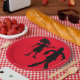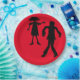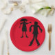 Zombie party paper plates. Bright red colour with two walking zombie images in black. Fun for birthdays with a horror theme, or for Halloween.