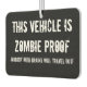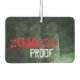 Zombies, on a car air refreshener, why not. Show the zombies art with 'zombie proof' to the front and then have the slogan side inside your car to make them laugh when they get in... choose between fragrances for long lasting freshness (unless you go and give zombies a lift, of course). Art and slogan copyright Mindgoop.