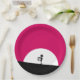 Paper plates with a cool zombie dude. Pink and black bold vibrant colour scheme.  A zombie silhouette with arms outstretched on the hunt for brains. A big white moon illuminates from behind.