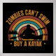 Awesome kayaking design T-shirts, posters, bags, planners, and more featuring a silhouette kayaking on a river, trees, and text that reads Zombies Can't Swim Buy a Kayak! Funny kayaker design T-shirts and more make great gifts for the avid kayaker!