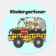 Zoo animals including a zebra, monkey, giraffe, and hippo ride the yellow school bus to kindergarten on our Zoo Animals Kindergarten T-shirts, mugs, cards, stickers, tote bags, sweatshirts, and other kindergarten gear.